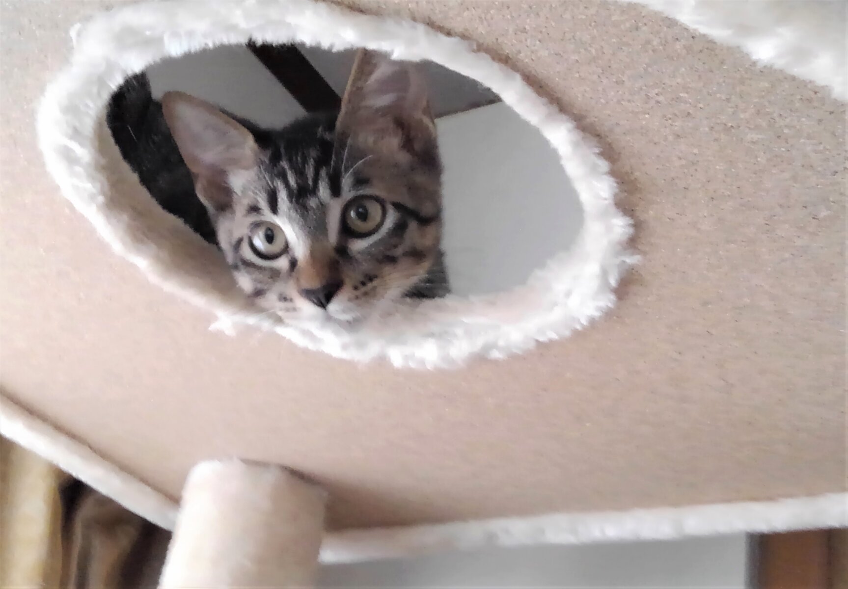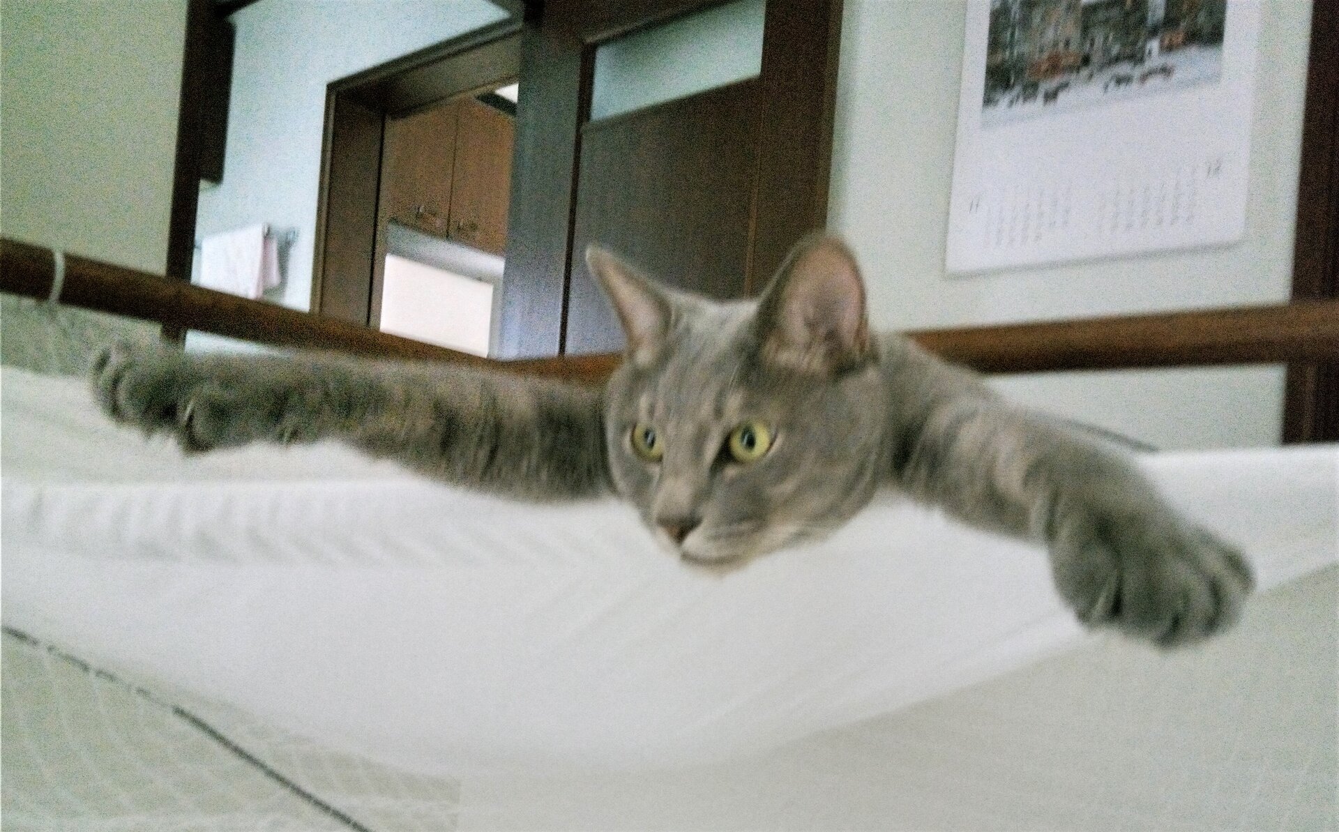 2022年09月16日 グリちゃん、負けるな!・・・&猫カレンダーの参加賞 猫カレンダーに応募したが、今回もダメでした。それでも参加賞が届きます。ここは転落防止用に張ったが、いつしかハンモックと化した所・・・ブブから取り戻してからは、いつもここにいる気がする。グリの格好がおかしかった^^;何故って?前脚を伸ばして万歳~~~(笑じゃなくて、階段を見下ろしていた。上がってくる人間や猫たちを見張っているかのよう…(笑ここは僕のお気に入り・・・。もう誰にも渡さないもんね~~~♪グリを保護した数日後、手すりに載って転落!階段の凸凹に体をぶつけて骨折した。転落防止に布を張ったのに、またしてもヤンチャをしていた。それで下には害獣除けのネットを張って、二重にガード・・・。また同じことをトトがしては困る(笑怖いグリおにいちゃんが此処にいたほうが危険防止にはなる(笑1階ダイニングにて。トトはグリが来ても怖がることもない。グリの方が唸る・・・(^^;身体はグリの三分の一くらいの大きさしかない。トトは食卓に上って、私の食べ残しを舐めていた。母猫や兄弟猫と離れ、一人残された時の飢餓感がそうさせるのだろうか。食いしん坊のブブさえしなかったことだ。まだまだ完全フリーには出来ないなあ・・・。