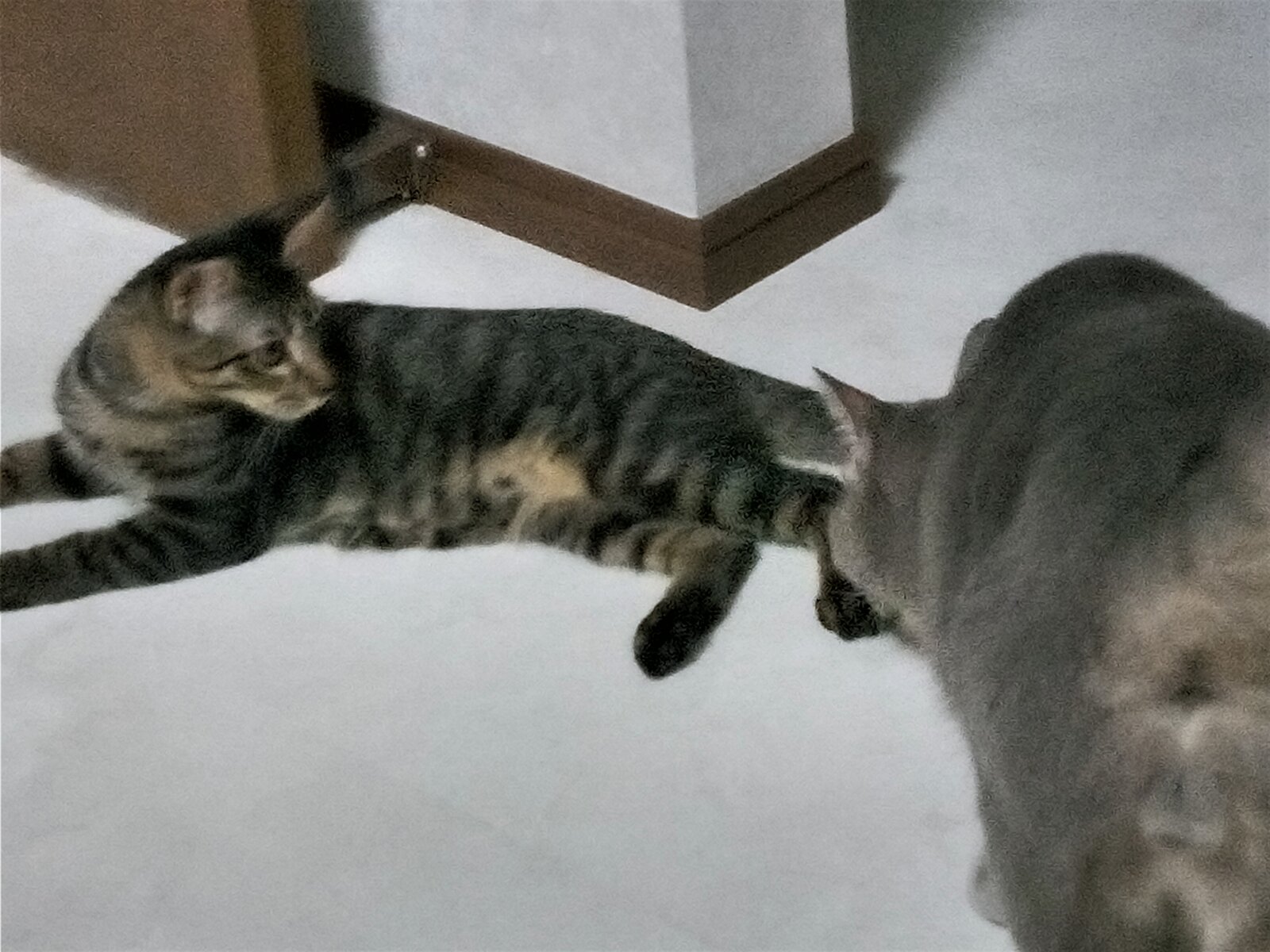 2022年09月26日 グリとトト ブログ更新をさぼっていてすみません~。猫たちは元気です!グリも、少しずつトトたちに寛容になってきました(笑トトは子猫なのに、誰に対しても猫パンチをお見舞いしています^^;↓ 外がよく見えるので猫たちに人気の場所。手前がグリ、奥、カーテンに隠れているのがトトです。大きくなりました(笑ブブにカップボードの天辺以外、すべて奪われたグリ。それでもブブを力で追い出すでもなく、不機嫌そうに唸っていた。弱気なブブだと思っていたのに。ビビ親子に絡んでいくしグリにも絡んでいく。流血騒ぎはエイズ持ちのブブなので避けたい。気を揉みながら猫たちを見ています(笑トトは天衣無縫!ビビはまだトトを守ろうと側から離れません。少しずつですが、お互いを認めるような雰囲気が出てきました。ただ大人猫がトトに手を出すような仕草をするとビビは即座に守る態勢になりますね^^続きを読む