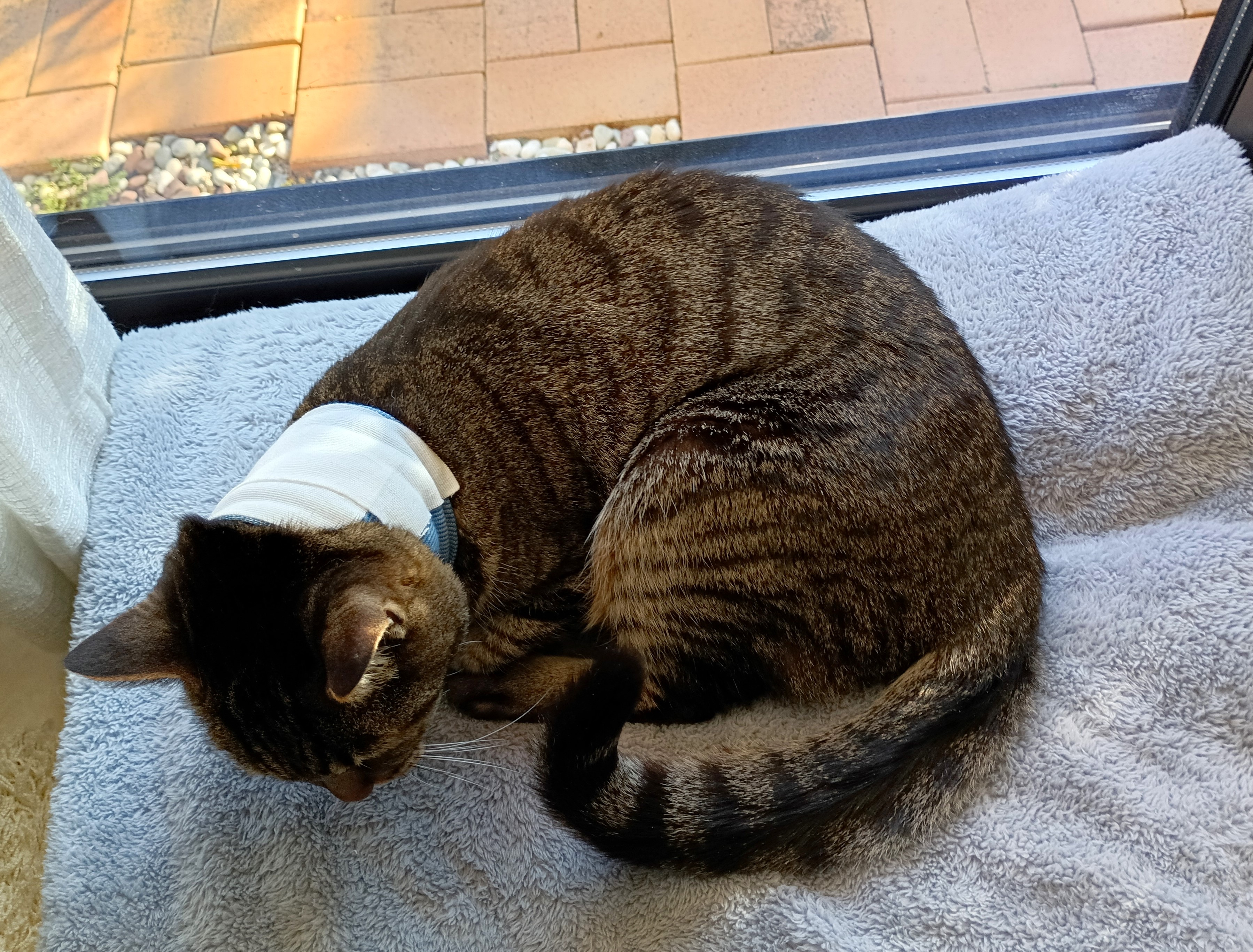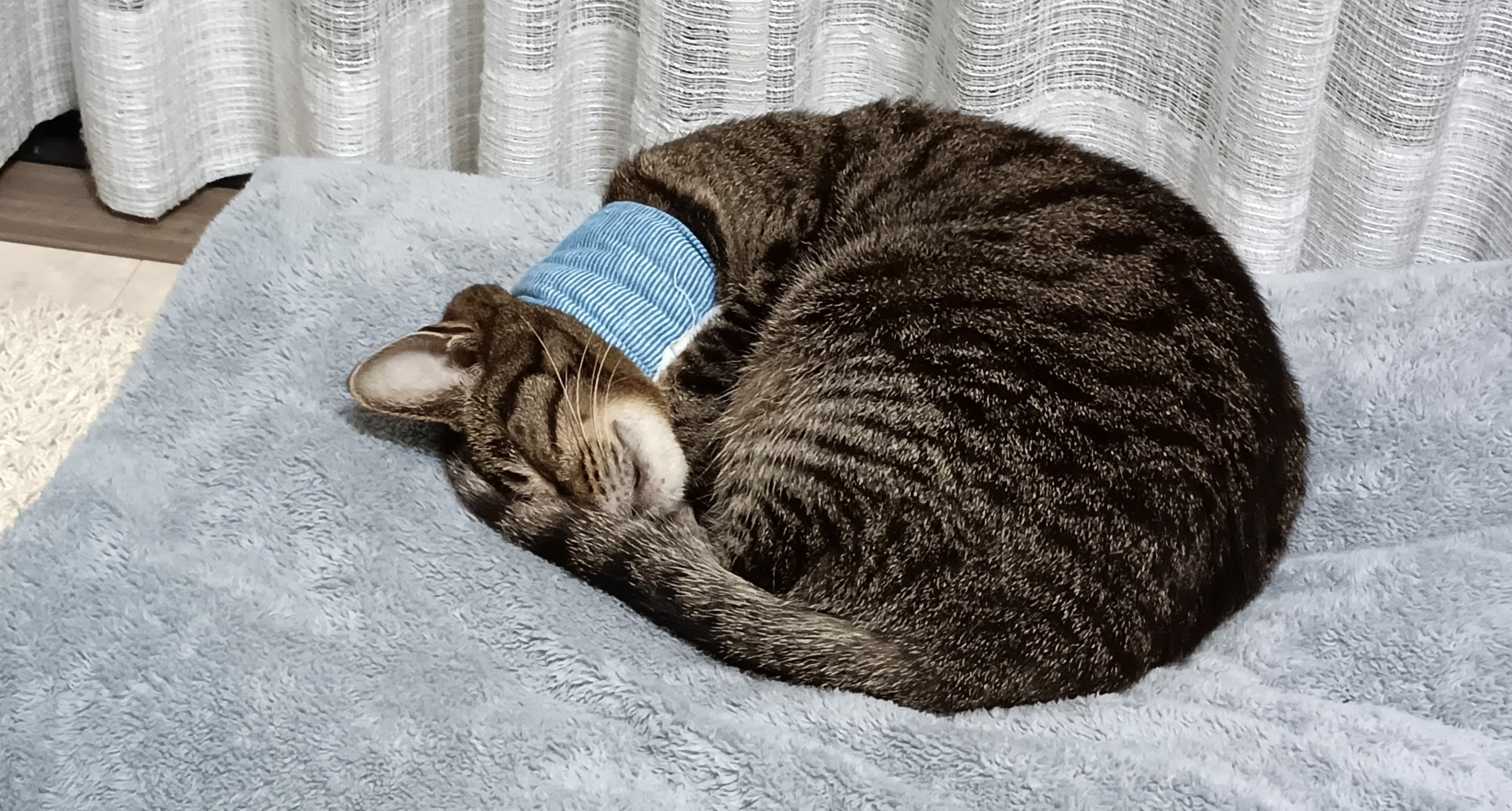 エリザベスカラーの代わりに首を包帯巻きにされました。