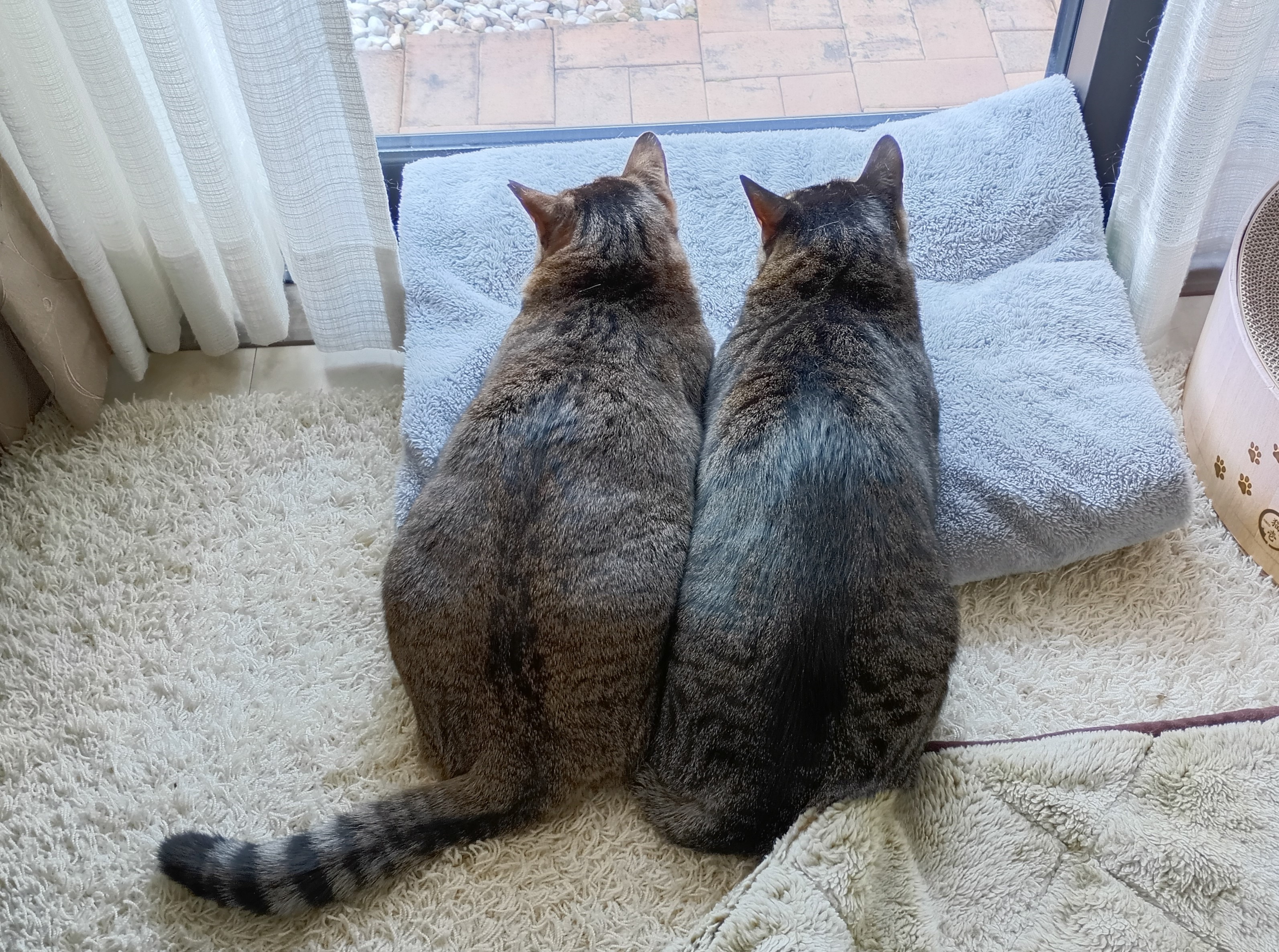 お日様が温かな窓辺で仲良く毛繕い中です。